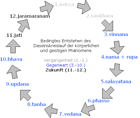 •  bhava-taṇhā: Wir sehen uns als ein ICH als Seele oder Person gegenüber der Welt und streben nach dauerhafter Fortexistenz. die Natur der bedingten bzw. weltlichen Dinge ist jedoch anicca, dukkha und anatta. Dieser Gegensatz ist die Ursache zum Leiden.