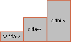 "Mit dem 1. Pfad-Erkenntnis (Sotāpatti): die Wahrnehmungsverzerrung, die Verzerrung des Bewusstseins und der Anschauung, das etwas vergängliches unvergänglich ist, das etwas selbstloses selbsthaft ist; außerdem die Verzerrung der Anschauungen, das leidvolles freudvoll ist, das unreines rein ist. Mit dem 3. Pfad-Wissen (Anāgāmitā): alle Verzerrungen der Wahrnehmung und des Bewusstseins das unrein rein ist werden beseitigt. Mit dem 4. Pfad-Wissen (Arahatta) werden alle Verzerungen der Wahrnehmung und des Bewusstseins das leidvolles freudvoll ist beseitigt (Vis.M. XXII, 68)."